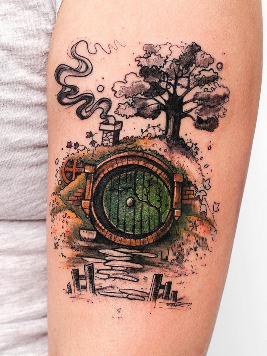 Bag End The Shire Hobbit Hole Tattoo Done By Henbo Henning Sleeve Tattoos Hand Tattoos For Guys Lotr Tattoo